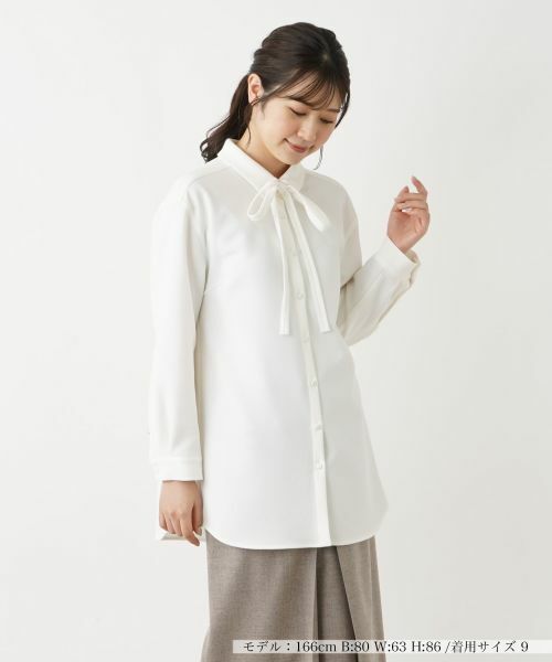 表面感のあるやや薄手の生地で仕立てたボウタイブラウス。リボンのような細身のボウタイは取り外しでき、2wayでの着こなしが楽しめます。ドロップショルダーでシルエットに程よくゆとりをもたせ、リラクシーな着心地を叶えました。袖口剣ボロ部分のボタンの表情を変えることでさりげないアクセントに。身体のラインを拾いにくく、ヒップまで隠れるのでナチュラルに体型カバーできるのもポイント。パンツにもスカートにも合わせやすく、着回し力に優れた一枚です。