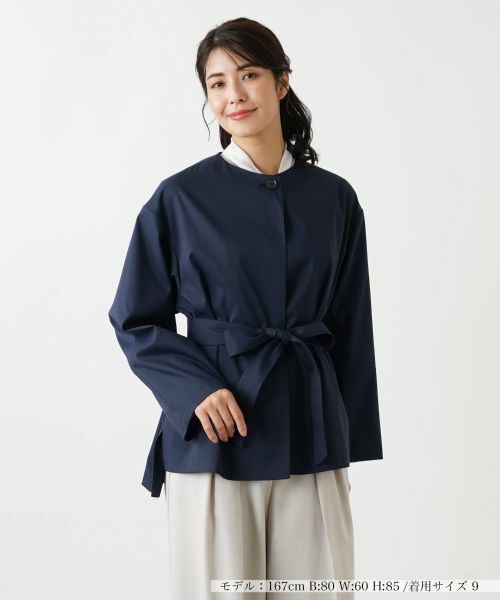 程よいハリと伸縮性のある生地で仕立てたノーカラーショートコート。ドロップショルダーで肩ラインを落とし、リラクシーな着心地を叶えました。ハイウエストで共布ベルトをマークすればメリハリの効いたこなれ感のあるスタイルに。裾にはサイドスリットを入れて前後差をつけ、絶妙なバランスの抜け感をプラス。ベーシックなパンツでまとめたスタイルはもちろん、エレガントなスカートを合わせたフェミニンルックとも好相性。