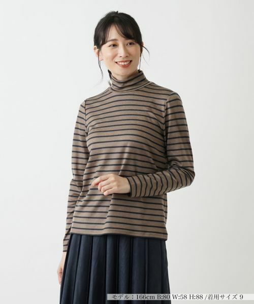 肌当たりのよいナチュラルな風合いの杢調ファブリックに、等間隔のボーダーを落とし込んだハイネックカットソー。心地よくフィットするようなすっきりとしたシルエットでスマートにスタイリングできる一枚。高さのあるネックが気になるデコルテを自然とカバーし、上品な雰囲気に仕上がります。ジャケットやコートのインナーとしてはもちろん、単品での着こなしもおすすめ。デイリーからオフィス、休日のお出かけまで多彩なシーンで重宝しそうなアイテムです。