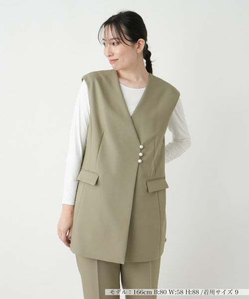 フロントに留めたパール調ビジューがアクセントになったセミロング丈のVネックベスト。前立てはパール調ボタンとスナップボタンにより開閉が可能。シャープなネックラインが絶妙なバランスの抜け感を演出。生地には程よいストレッチ性があり着心地も快適。フロントウエストにはフラップポケットをバランスよくレイアウトしています。シンプルな無地でインナーやボトムスともコーディネートしやすく、ヒップまで隠れる丈感でナチュラルに体型カバーできるのも嬉しいポイント。