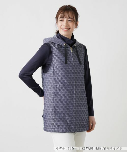 落ち着いたカラーリングを基調にモノグラム柄をあしらった、スタイリッシュなフーデッドベスト。派手になりすぎることなく、上品な佇まいに仕上がります。フロントはジップアップ仕様で着脱がスムーズ。ドローストリング付きのフードが機能性を高め、実用的でありながらスポーティな印象もプラス。軽やかな素材感で動きやすく、肌寒い季節のアウターとしておすすめの一着です。アウトドアシーンでは防寒性と動きやすさを活かして活躍し、カジュアルなパンツルックにはもちろん、スカートと合わせても程よい抜け感のあるコーディネートが完成します。