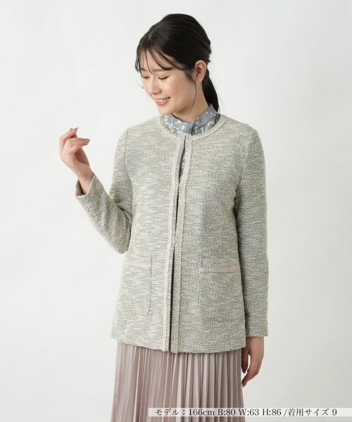 味わい深い表情のツイードニットを使用した、コンパクトなシルエットのノーカラージャケット。襟のないすっきりとしたデザインが顔周りをシャープに見せ、きちんと感がありながらも軽やかな着こなしを叶えます。細身のパンツと合わせてシンプルにまとめるのはもちろん、ロングスカートとコーディネートすれば女性らしいフェミニンなスタイリングに。オン・オフ問わず幅広いシーンで活躍するエレガントな一着です。フロントは鍵ホック仕様により開閉が可能。