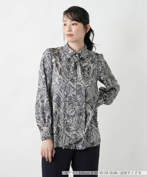 クラシカルなペイズリー柄が印象的なボウタイブラウス。華やかなボウタイデザインがエレガントな雰囲気を演出し、フォーマルからカジュアルまで幅広いシーンで活躍します。柔らかく滑らかな生地感で、肌触りが良く快適な着心地。袖口にはギャザーを施し、程よいボリューム感が女性らしさを引き立てます。パンツスタイルにもスカートにも合わせやすく、ジャケットのインナーとしても映える一枚です。※定価(税込)は、2025年6月27日のセール開始前の店舗における販売価格です。手洗い可酸素系漂白可タンブル乾燥不可つり干し(日陰)アイロン低温120℃まで石油系溶剤ドライクリーニング弱ウェットクリーニング(弱い処理)