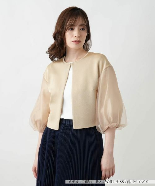 繊細なシアー素材で切り替えたボリュームスリーブが印象的なデザインカーディガン。軽やかな透け感が女性らしいニュアンスを添えつつ、コーディネートにモードなアクセントを加えてくれる一着です。ショート丈のコンパクトなシルエットはロングスカートやワンピースと相性抜群。ウエスト位置を高く見せることで、スタイルアップ効果も期待できます。首元はホック留めで開閉が可能。週末のお出かけからパーティーなどのエレガントなシーンにも対応できる一着です。