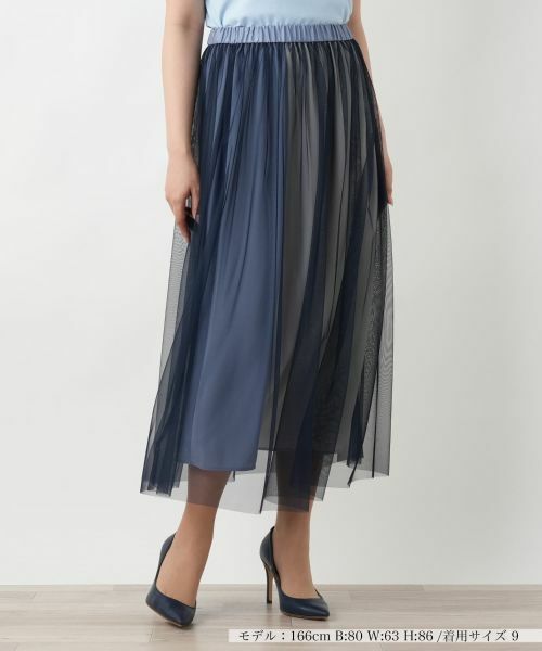 繊細なチュール素材を重ねた、エレガントな雰囲気を醸し出すフレアスカート。ほのかな透け感が女性らしい柔らかさを引き立て、動くたびにふんわりと揺れるシルエットが魅力です。裾に向かって広がる優雅なラインがフェミニンな華やかさを後押しし、ウエストは総ゴム仕様でストレスフリーなはき心地をキープ。カジュアルなTシャツと合わせれば抜け感のあるスタイルに、ブラウスやコンパクトなトップスと合わせれば上品なコーディネートに仕上がります。