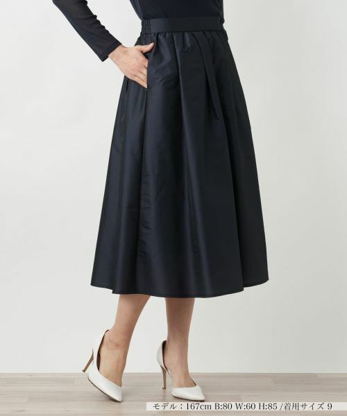 上品な光沢を湛える程よくハリのある生地で仕立てた、大人の女性らしいエレガントな佇まいのフレアスカート。ウエストは程よくシェイプされ、裾に向かって大胆に広がるドラマティックなシルエットがインパクトたっぷり。立体感のあるギャザーがメリハリを強調するので、タックインすればスタイルアップ見せ効果も期待できそうです。バックウエストはゴム仕様となっており、快適なフィット感を実現します。サイドホック&ファスナーにより開閉が可能です。