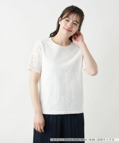 ペイズリー模様のレースを贅沢にあしらったカットソー。フロントからスリーブまでレース仕立てにすることで、華やかさと軽やかさを演出しました。統一感のある上品なワントーンデザインで、シンプルながらも存在感のある一枚に。ネックラインはすっきりと仕上げ、さりげない抜け感をプラス。デニムと合わせてカジュアルに、フレアスカートでフェミニンにまとめるなど、ボトムス次第で幅広いスタイリングにマッチ。ジャケットのインナーとしてもおすすめです。