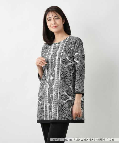 目を惹く繊細なペイズリー柄が印象的な七分袖ブラウス。ヒップまでしっかり隠れる安心感のある丈で、身体のラインをやさしくカバーしてくれます。すとんと落ちるシルエットが着こなしをスマートに見せつつ、動きに合わせてふわりと揺れる上品な軽やかさも魅力。一枚でサマになるデザインで、シンプルなボトムと合わせるだけで上級者らしいコーディネートが完成します。