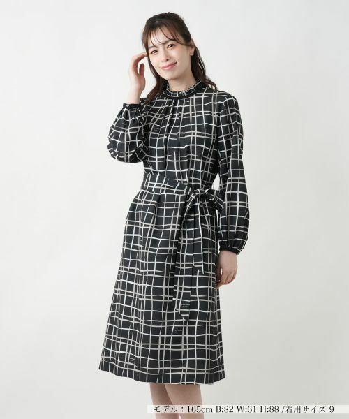 グラフィカルなランダムチェックが目を惹くフレアワンピース。襟周りにフリルをあしらい、ほんのり甘さを感じさせるエッセンスに。ふんわりと広がるシルエットが大人エレガントな雰囲気を演出。付属の共布ベルトをハイウエストでマークすれば、自然とスタイルアップ見せ効果も期待でき、メリハリのある洗練されたシルエットに。一枚で旬のコーディネートが完成する、多彩なシーンで活躍してくれそうなアイテムです。バックファスナーにより開閉が可能。アンダースカート付き。