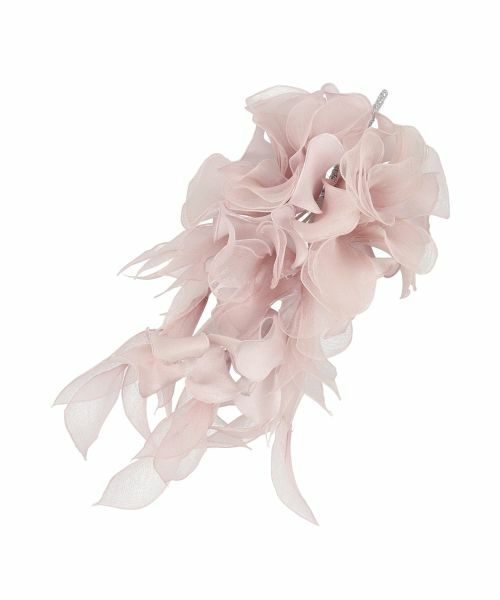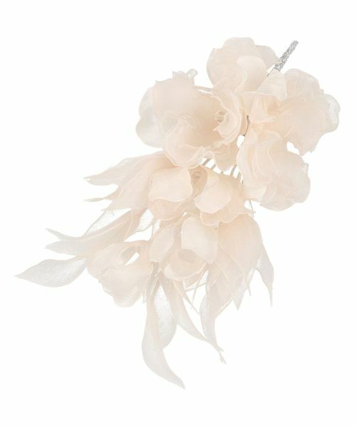 シルクオーガンジーやサテン素材を使用したフラワーモチーフのコサージュ。繊細で軽やかな素材がふわりとした立体感を生み出し、上品で優雅な雰囲気を演出。控えめながらも上品に輝くビジューをあしらい、さりげない華やかさをプラス。添えるだけでシンプルな装いにもエレガントなアクセントを加えてくれます。結婚式やパーティーなどの特別なシーンにふさわしく、定番のドレススタイルを一層引き立てる、洗練されたアクセサリーです。安全ピン留め。