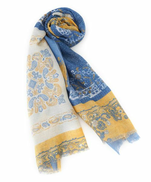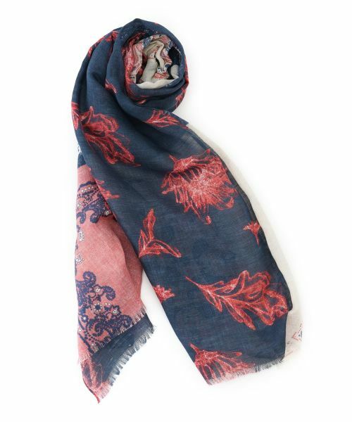オリエンタル調のペイズリー柄とアートなボタニカル柄の2種類の柄がポイントのミシン巻きのストール。クラシカルなエッセンスを感じさせるデザインが、シンプルなコーディネートにアクセントを加えます。コットンに麻をブレンドした生地は軽やかで通気性がよく、縁は断ち切りフリンジで仕立てられ、さらりとした爽やかな肌触りがポイント。首元に巻いたり、肩にふんわり羽織ったりと、スタイリング次第でさまざまな表情を楽しめるアイテムです。季節の変わり目や日差しの強い日のお出かけにぴったりの一枚。