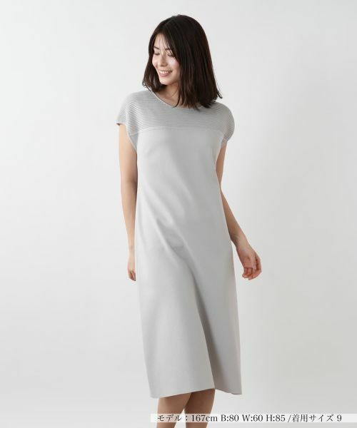 ネックや肩周りを細やかなボーダー状の編み柄で切り替え、シンプルながらも表情のあるデザインに仕上げたニットワンピース。軽やかなフレンチスリーブがこれからの季節にぴったりの涼やかなニュアンスを感じさせます。程よく開いたクルーネックですっきりとまとめて絶妙なバランスの抜け感をプラス。ヒップまでしっかりとカバーする着丈でリラックス感のある着心地ながらも、スタイルアップ見せ効果も期待できる一枚です。
