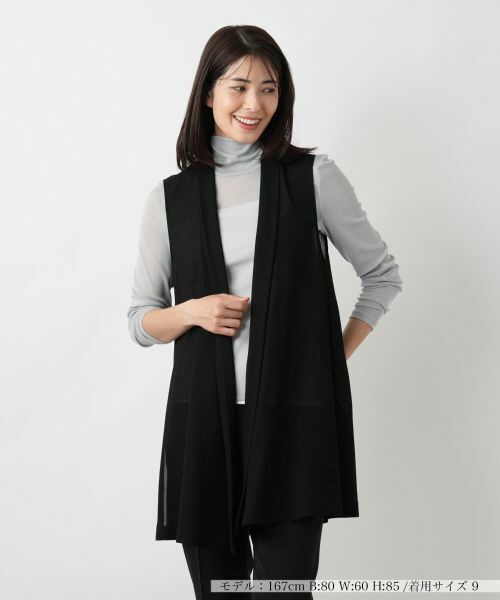 シアー感のある素材で仕立てた、ヒップラインを包み込むセミロング丈のベスト。滑らかな編地がつくる落ち感と直線的なシルエットが、さりげなく大人の女性らしいエレガンスをプラス。裾にはサイドスリットを入れて絶妙なバランスの抜け感を演出。シンプルなトップスに重ねるだけで、スタイルに奥行きを与えるレイヤードが完成します。テクニックいらずで装いをアップデートできる、着回し力の高い注目のアイテムです。