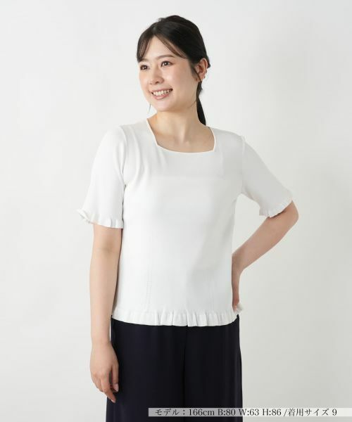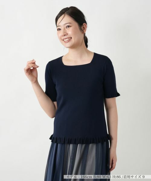 すっきりとしたシルエットが美しい、無地のスクエアネックニット。ゆったりと開いたネックラインがデコルテを綺麗に見せ、程よい抜け感を演出。女性らしい上品な佇まいの中に、袖口や裾のフリルがさりげなく甘さを添え、シンプルながらも表情豊かな一枚に仕上げました。ハイゲージニットはさらりとした肌触りと適度な伸縮性が心地よく、軽やかな着心地を叶えます。