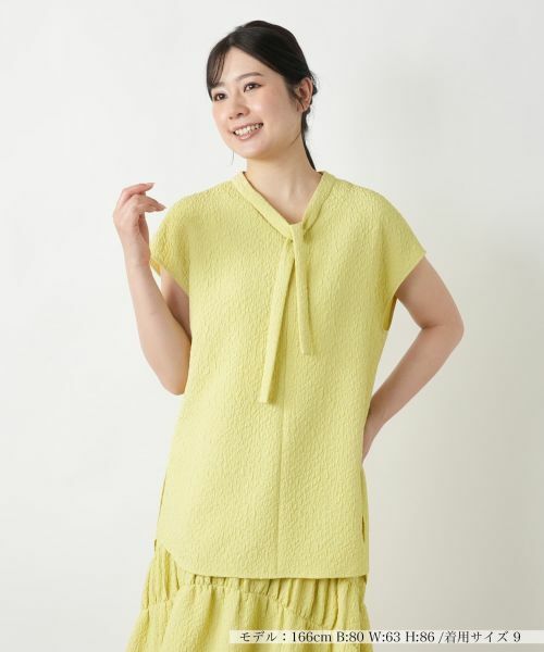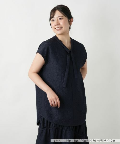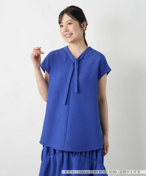 凹凸のある独特な表面感が特徴のボウタイブラウス。立体的なテクスチャーが生み出す陰影が奥行きを感じさせ、シンプルながらも存在感のある一枚に仕上げました。フレンチスリーブが腕まわりをすっきりと見せながら、涼やかかつ軽やかな印象をプラス。フロントにあしらわれたボウタイは、動くたびに優雅に揺れてフェミニンなエッセンスを添えてくれます。すっきりとしたネックラインや裾のサイドスリットが絶妙な抜け感を演出。セットアップ対応可。