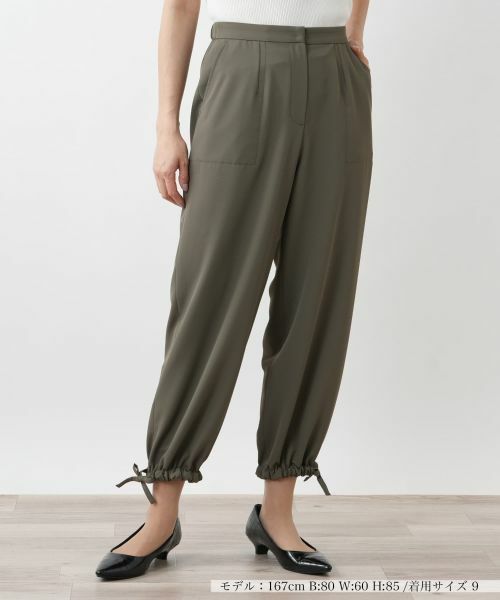 程よくゆとりをもたせた、リラックスシルエットのクロップドパンツ。フロントには存在感のあるポケットをレイアウトし、さりげないアクセントをプラス。バックウエスト部分のみゴム仕様となっており、すっきりとした見た目ながらも快適なフィット感を実現。トップスをインしても美しく決まるのがポイントです。裾にはゴムを施し、さらにドロストリボンでの調整も可能。気分に合わせたアレンジが楽しめます。ブラウスやニットと合わせてきれいめに、カジュアルなトップスと合わせればこなれ感のある大人のスタイルに仕上がる一本です。