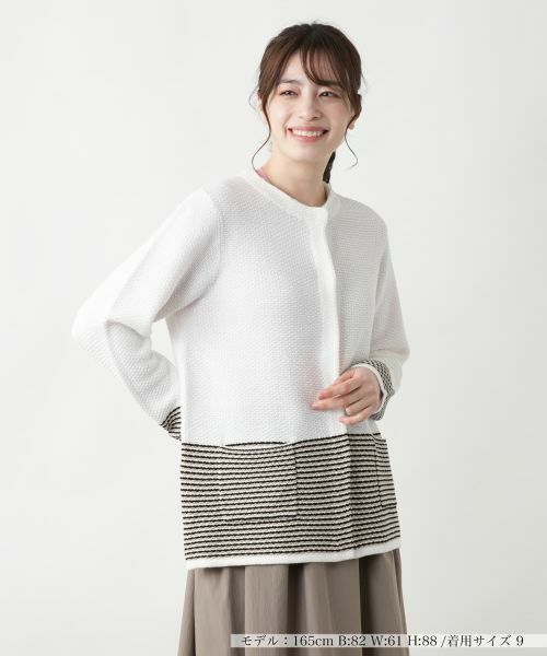 ざっくりと編み込まれた表情豊かな素材感のノーカラーニットジャケット。程よくゆとりを持たせたシルエットが、リラックス感を演出しながらも、上品な佇まいを作り出します。フロントは比翼仕立てですっきりとさせ、袖口や裾まわりにはボーダーの切り替えを施し、シンプルながらも遊び心のあるデザインに。爽やかなアクセントが加わることで、カジュアルにもシックにも馴染み、幅広いコーディネートが楽しめます。