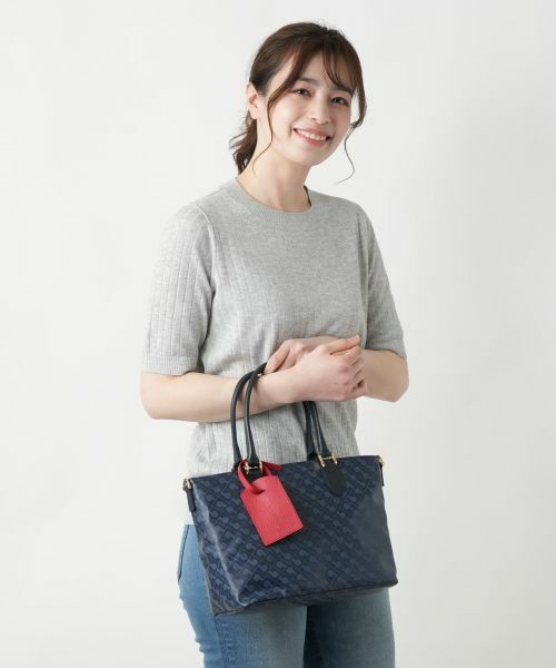 エレガントなモノグラム柄が印象的なトートバッグ。開口部はファスナー仕様になっており、中身をしっかりと守りながら、安心して持ち歩ける実用性の高さも魅力です。内部は三層構造になっており、荷物を整理しやすく、使い勝手の良さにもこだわりました。ショルダーストラップが付属しているので、肩掛けスタイルにも対応。その日の気分やコーディネートに合わせて楽しめます。ハンドルからさがるタグがアクセントとなり、さりげない遊び心をプラス。オンオフ問わず活躍する、スタイリッシュで機能的なバッグです。
