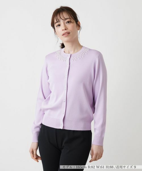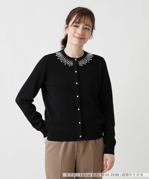 襟元に施された幾何学的なパール調ビジューの装飾が、アクセサリーなしでも顔周りをパッと明るく引き立てるニットカーディガン。さらにパール調ボタンを用い、細部までこだわりを感じさせるデザインに。柔らかな生地感で快適な着心地を実現し、長時間の着用でもストレスフリーで過ごせる一枚です。パンツやスカートと合わせるだけで、手軽にエレガントなスタイリングが完成するので、デイリーコーデから週末のお出かけ、特別な日のお呼ばれまで幅広いシーンで活躍してくれそうです。