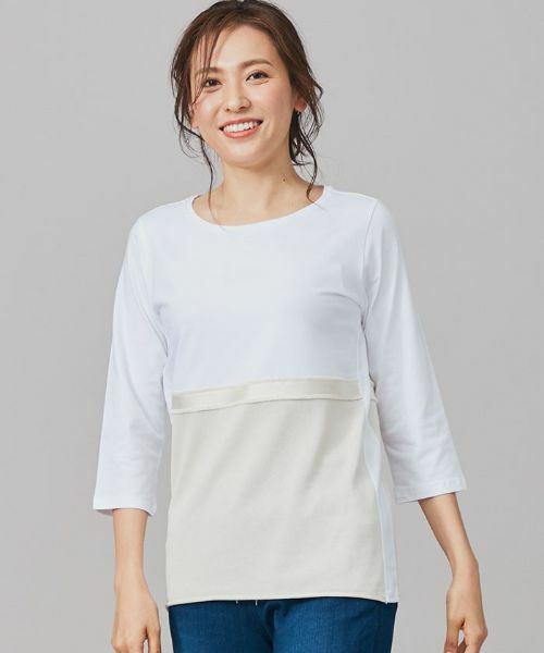 バイカラーの切り替え部分に光沢のあるテープをのせ、アクセントを取り入れた7分袖トップス。華奢な手元をアピールできるクロップドスリーブがポイントです。凝ったデザインなのにデイリースタイルに合わせやすいのが◎。※定価(税込)は、2021年05月28日のセール開始前の店舗における販売価格です。家庭洗濯不可漂白不可タンブル乾燥不可アイロン低温160℃まで石油系溶剤ドライクリーニング弱ウェットクリーニング不可