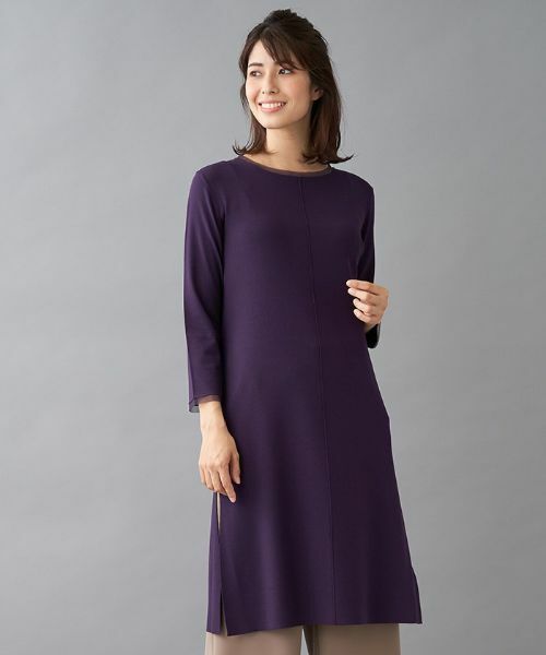 ハイゲージの滑らかな風合いが美しいクルーネックニットチュニック。ネックラインにシアーなチュールを添えた上品さのあるデザインが印象的。ヘムサイドに深めのスリットを配した、動きやすいデザインです。※定価(税込)は、2022年01月02日のセール開始前の店舗における販売価格です。家庭洗濯不可漂白不可タンブル乾燥不可アイロン低温120℃まで石油系溶剤ドライクリーニング弱ウェットクリーニング不可