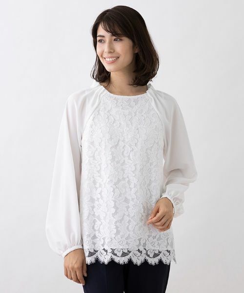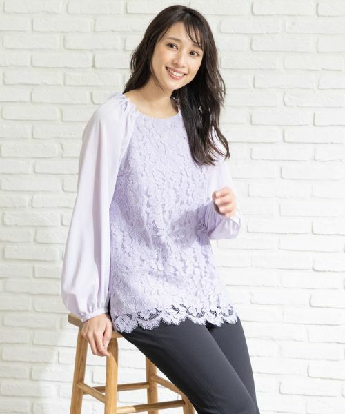 前身頃にフランス製の繊細なコードレースを使用したブラウスです。袖と後ろ身頃は伸縮性のある無地素材を使った動きやすく着心地の良いデザイン。ヒップが隠れる着丈なので、ボトムを選ばず着回しが効くのも嬉しいポイント。ジャケットインするとレースが華やかなエレガントブラウスです。※定価(税込)は、2022年06月29日のセール開始前の店舗における販売価格です。家庭洗濯不可漂白不可タンブル乾燥不可アイロン低温120℃まで石油系溶剤ドライクリーニング弱ウェットクリーニング不可