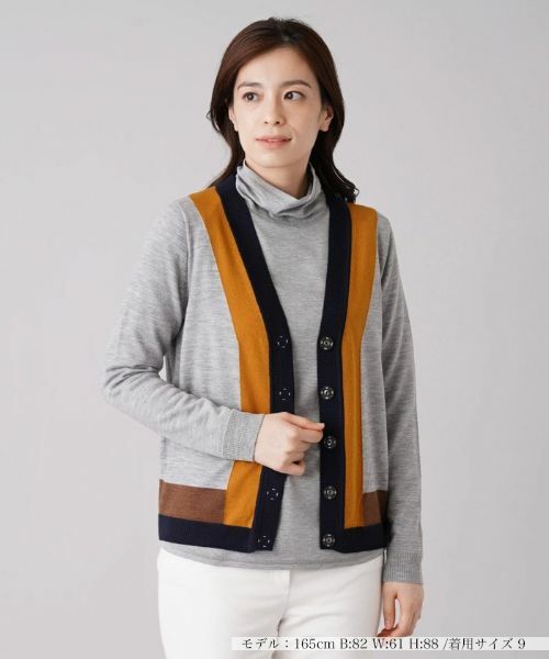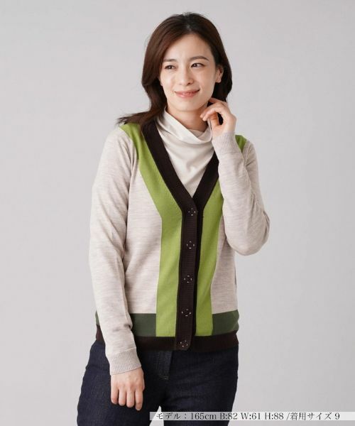 コントラストの効いた配色ラインがインパクトを放つ、Vネックニットカーディガン。どこかトラッドなムードを漂わせながら、ハイゲージニットの滑らかな風合いも相俟ってエレガントな表情を見せてくれる1枚となっています。フロントはスムーズに着脱できるスナップボタン仕様。ベーシックな丈感で着こなしやすく、薄手のシンプルなカットソーなどに合わせるだけでもきちんと感のあるコーディネートに仕上がるのも魅力です。