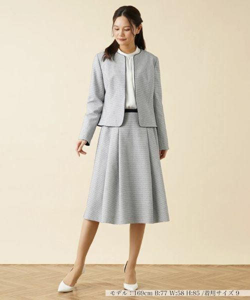 さらりとした風合いの生地にレトロテイストの柄を施した、ノーカラージャケットとスカートの上下2点セット。ジャケットはフロントホック留めですっきりとした印象に。袖口はスリット入りで折り返してのアレンジも可能。タックプリーツスカートはサイドホック&ファスナーにより着脱が行えます。ジャケットには配色パイピング、スカートは配色ウエストでメリハリ感をプラスしています。------------------------------------着用シーズン:初夏伸縮性:なし透け感:なしポケット:あり生地の厚さ:やや薄手裏地:ありウエスト:伸縮性ありなし-------------------------------------※商品の色味は、撮影場所や光のあたり具合、お客様のお使いの機器により色味が違って見える場合がございます。予めご了承ください。※定価(税込)は、2023年06月29日のセール開始前の店舗における販売価格です。