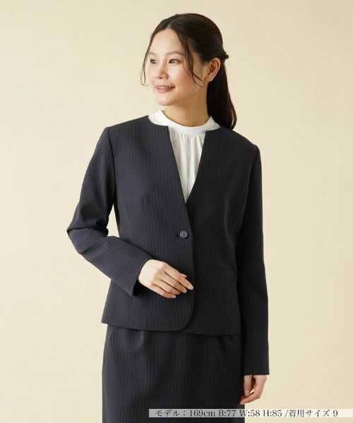 ほんのり浮かぶオルタネイトストライプがレトロシックな趣を見せるノーカラージャケット。シャープなネックラインや袖口のスリットが絶妙なバランスの抜け感を演出。フロントは1つボタン仕様でこなれ感のある着こなしを後押しします。カジュアルなカットソーやブラウスに重ねるだけでも品よく仕上がるアイテムです。