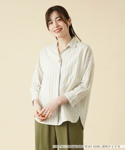 優しいトーンのマルチストライプが彩る比翼ブラウス。開放的なムードのオープンカラーで仕上げ、大きめの貝調ボタンがエレガントなアクセントをプラス。ドロップショルダーと身幅にゆとりを持たせた前後差のあるシルエットで、カジュアルなパンツなどに合わせやすいのも魅力です。袖は七分袖で軽やかなニュアンスに。コットンにリネンをブレンドした爽やかな風合いの生地を使用しているので、これからの季節にぴったりです。