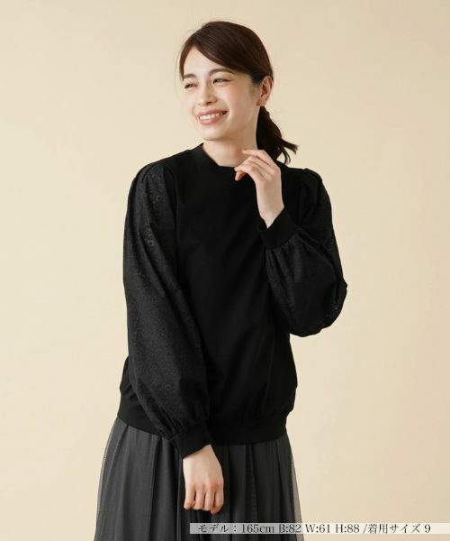 フラワーレースで切り替えた、ふんわりとしたボリュームスリーブが特徴的なカットソー。デコルテをさりげなくカバーしてくれるハイネックもトレンドライクな注目のディテール。統一感のある色使いでボトムスを選ばずにコーディネートしやすい一枚。カジュアルな着心地ながら、大人フェミニンな雰囲気で楽しめるトップスです。