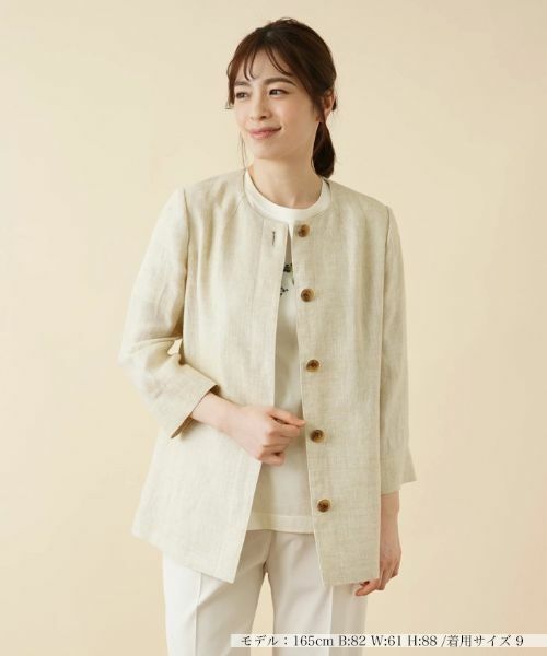 麻100%を使用したナチュラルな風合いがこれからの季節にぴったりなノーカラージャケット。フロントは比翼仕立てですっきりとした印象でデザインしました。大きめのボタンをあしらった、コーディネートを軽やかに盛り上げてくれる一着です。ヒップまで隠れるゆとりのあるシルエットでライトアウターとして活躍してくれるアイテムです。