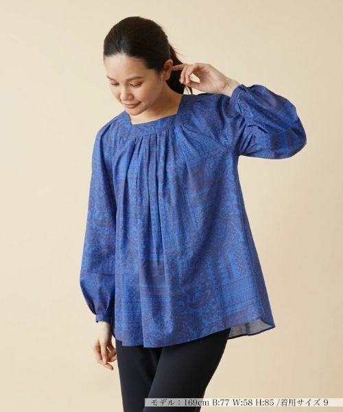 カラーニュアンスを合わせ、色の濃淡でオリエンタル柄を表現した技アリのお洒落ブラウス。よく見ると分かる細やかなデザインだからこそ、遠目からでもひと味違ったオーラを発揮。デコルテ周りをキレイに引き立てるスクエアネックもポイントになっています。裾にはサイドスリットを入れ、さりげない抜け感をプラス。ゆったりとしたシルエットなので細身のパンツでまとめると好バランスなコーディネートに。袖口はボタン開閉可能。バックファスナーあり。