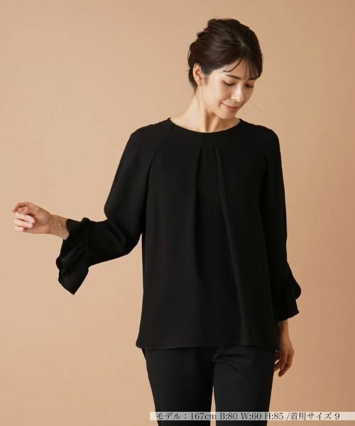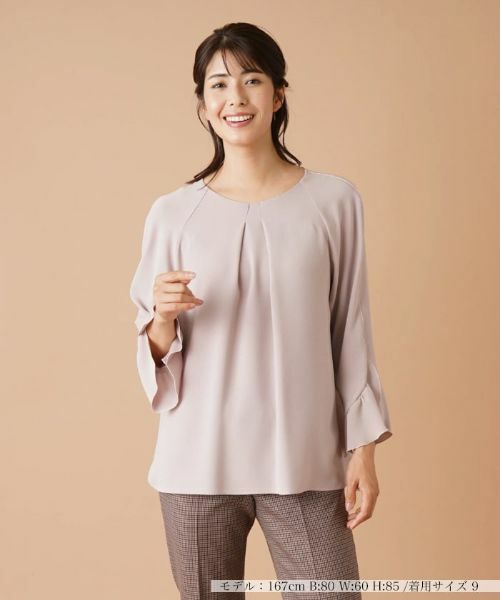 肌触りのよいしなやかなテキスタイルがドレープ感のあるエレガントなシルエットを描き出すオーバーブラウス。ふわりと広がったフレアスリーブの袖口が動きに合わせて揺らめき、手元に女性らしい抜け感をもたらします。袖付けはラグランカットで程よいリラックス感を生み出しています。バックネック中央に施した涙あきもポイント。シンプルなデザインでパンツ、スカートのどちらにもコーディネートしやすくなっています。
