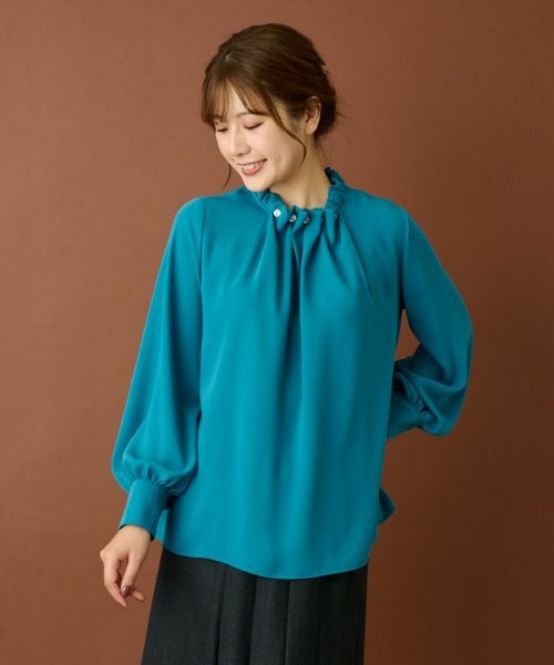 ギャザーを寄せたネックやふんわりとしたボリュームスリーブが女性らしい柔らかなシルエットを作り出すブラウス。ネック周りにはビジューが煌めき、エレガントな表情に。発色が綺麗で落ち感のあるマットサテン素材を使用しており、身体にはりつかずゆったりとした印象でスタイリングできます。ロングスカートとの相性もよく、これからの季節らしい大人シックなフェミニンルックが楽しめるアイテムです。