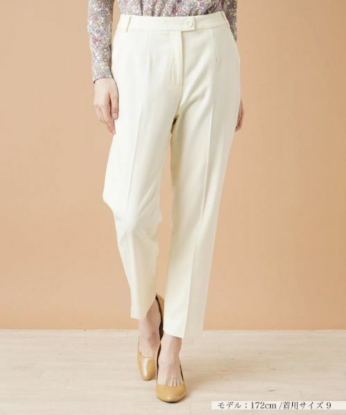 やや細身のテーパードシルエットが美脚スタイルを演出してくれる、センタープレス入りのアンクルパンツ。無駄な装飾を省いたシンプルなデザインでトレンドに左右されることなく活躍します。カジュアルにもきれいめにもコーディネートできるボトムスは、大人のワードローブにマストな存在です。ボタン&ホック、ファスナーにより着脱が可能。