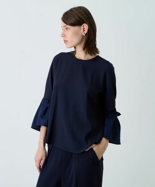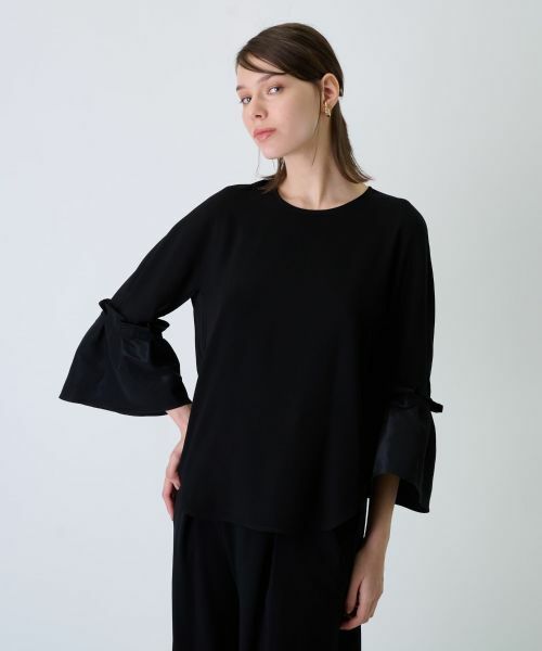 微細な光沢感とシルエットで魅せる、異素材スリーブのオーバーブラウス。艶やかな素材で切り替えたフレアスリーブが上品な華やぎを演出。前後差をもたせたステップドヘムはスタイリングに遊び心を加え、新鮮なニュアンスをもたらします。統一されたカラーリングが全体のルックスを引き締め、どんなボトムスとも絶妙にマッチ。派手になりすぎない佇まいは、様々なシーンでフレキシブルに活躍する万能さを叶えます。バックはスナップボタンにより開閉が可能。