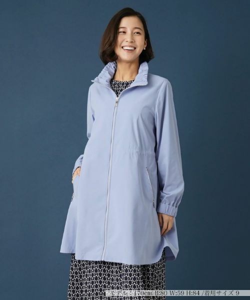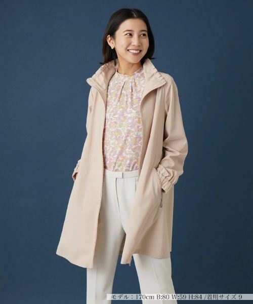 裏地のないさらっとした軽やかな着心地で、季節の変わり目に重宝しそうなミディ丈のコート。生地には撥水加工を施しているから少々の雨でも安心して着用できます。フロントはジップアップ仕様とし、着脱のしやすさにも配慮しました。スタンドカラーの襟周りにはゴムシャーリングを施してくしゅっとさせ、さりげなく柔らかなニュアンスに。袖口もゴム仕様とし、心地よいフィット感をもたせています。カジュアルな雰囲気で気負わずラフに着こなせるのも嬉しいポイント。