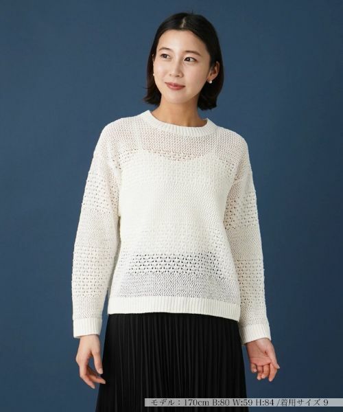 ボーダー状に透かし編みの模様を施した、シーズンらしい軽やかムードをいざなうニットプルオーバー。コットンに麻をブレンドした通気性に優れたニットを使用しているから、肌当たりもよく爽やかな着心地が感じられます。ネックラインは浅めに設定し、上品で落ち着いたニュアンスに。袖はドロップショルダーでリラクシーなシルエットを作り出しています。コーディネートを明るく彩るカラーリングで季節を先取りしてくれそうなトップスです。
