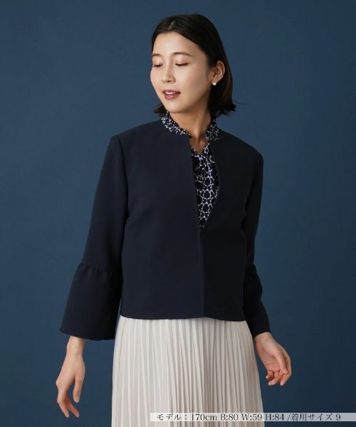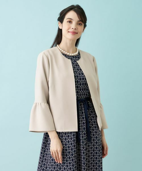 ふわりと広がるクロップド丈のフレアスリーブがフェミニンなムードを醸し出す、ノーカラージャケット。シンプルなボックスシルエットで甘くなりすぎないバランスに仕上げられており、コンパクトな丈感でワンピースやスカートとコーディネートしやすい一着。素材はシワになりにくいストレッチ混のダブルクロスを使用し、程よいハリ感で身体のラインを拾いにくいのも嬉しいポイント。フロントは鍵ホック留めとなっています。