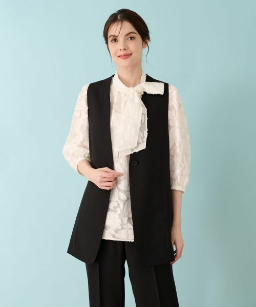 人気のジレはすっきりとした衿開きとシルエットがポイント。さらっとした肌さわりのポリエステル素材を使用しています。合わせるボトム次第でセレモニーからタウンまで幅広く活躍します。