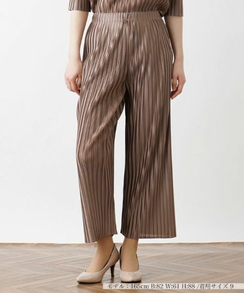 プリーツの巾を大小に組み合わせ、ミックスでプリーツをかけています。ウエストは総ゴムで履きやすく落ち感があるので美しいシルエットになります。適度な光沢感とシワになりにくい素材感が旅先やオケージョンシーンに重宝します。