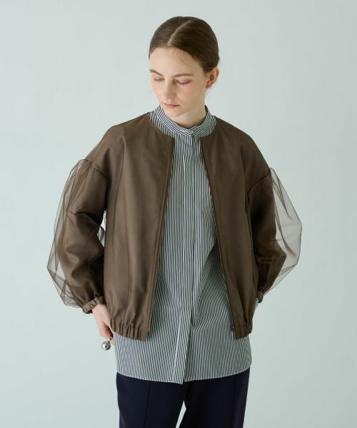 スリーブにふわふわのチュールを重ねることで、カジュアルなムードをちょっぴり引き算。サクッと羽織れる気軽さとこだわりのディテールを両立したジップアップブルゾンは、シンプルで終わらないアウター使いを叶えてくれるはず。