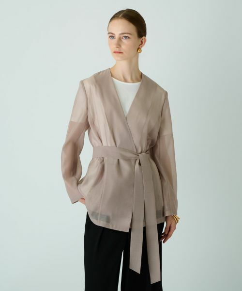 今シーズンらしいほんのりシアーな風合いのカシュクールジャケット。シャープなVゾーンが絶妙な抜け感を作り、涼やかな表情でスタイリングできる一着です。共布のリボンベルトがセットになっており、ハイウエストでマークすればメリハリの効いたスタイリングが手軽に楽しめます。ベルトを外してさらっと羽織るだけでもサマになり、お好みに合わせてアレンジが可能。エレガントからカジュアルな着こなしまで幅広く対応できるアイテムで、オンオフ問わず様々なシーンで活躍します。