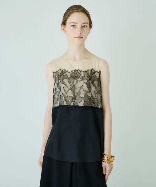 ヌーディーなシフォンにレースを重ねて繊細な透け感を存分に生かした、ノースリーブのプルオーバーブラウス。ブラックの異素材切り替えでシックに仕上げているから、甘さを抑えた大人レディならではの佇まいが叶いそう。