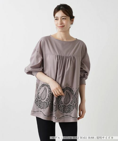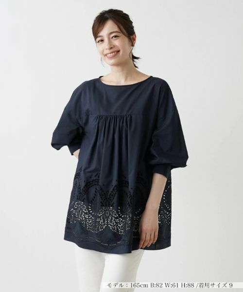 カットワーク刺繍の繊細なモチーフが目を惹くオーバーブラウス。コットンをブレンドした適度にハリのある生地感も相俟って、美しい佇まいをいっそう引き立てます。裾に向かって広がるギャザーたっぷりのフレアシルエットが特徴で、身体のラインを拾いにくく、スタイルを気にせずに快適に着用できます。細身のクロップドパンツと合わせれば、すっきりとした印象のコーディネートに。デイリーやオフィスカジュアル、少しおしゃれを楽しみたい休日まで、さまざまなシーンで活躍すること間違いなしのトップスです。バックネックの涙あきはループボタンにより開閉が可能。
