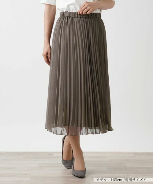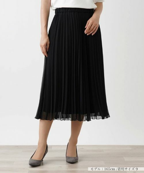 繊細なプリーツを施したミディアム丈のスカート。裾に向かって緩やかに広がりをもたせた美しいシルエットも相俟って、大人の女性らしいリュクス感溢れる着こなしを演出。ウエストは総ゴム仕様で心地よくフィット。タックインすれば脚長見せのスタイルアップ効果も狙えそうです。統一感のあるシンプルな色使いでトップスともコーディネートしやすく、使い勝手のよいアイテムです。