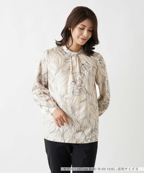 ラインで表現されたアーティスティックなボタニカル柄が目を惹くブラウス。立体感のあるボウタイ風のフロントがエレガントな女性らしさを感じさせます。袖には程よくボリュームをもたせ、ゆったりとしたトレンドライクな雰囲気に。肌触りのよいやや薄手のファブリックを使い、リラクシーなシルエットでデザインしています。定番のパンツでシンプルにまとめるのはもちろん、ロングスカートでフェミニンに仕上げるのもおすすめです。バックファスナーで開閉可能。