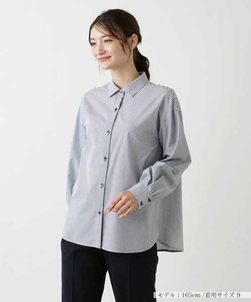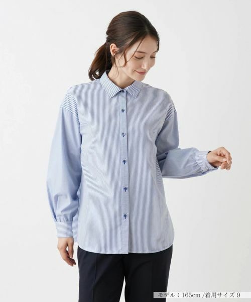 ピッチの異なるストライプがセンスを引き立てる、襟付きブラウス。さらりとしたやや薄手のコットン×ポリエステル生地を使用しています。シルエットはドロップショルダーでゆとりをもたせ、袖をボリュームスリーブで仕上げることで、肩肘張らないリラクシーな着心地を叶えました。ツーボタン仕様のカフスがさりげないアクセントに。定番のパンツルックはもちろん、フェミニンなスカートとも相性がよく、多彩なコーディネートが楽しめるアイテムです。