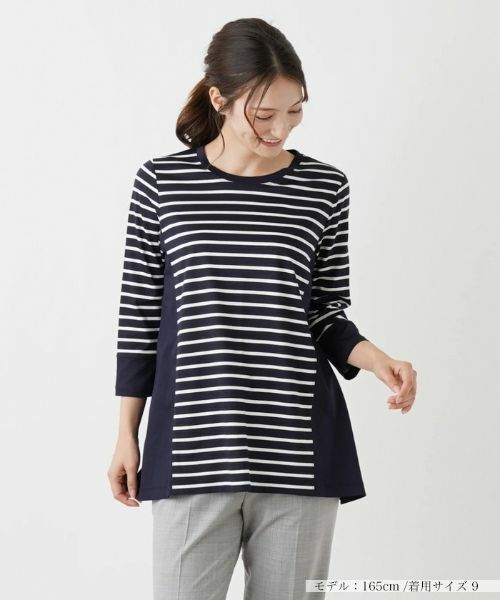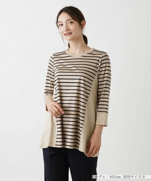 ボーダーと無地を巧みに切り替えた、技ありのコンビネーションが光るクルーネックカットソー。シルエットは抜け感のあるクロップドスリーブで、裾周りに広がりをもたせ、季節らしい軽やかなニュアンスに。ヒップまで隠れる程度の丈感なので、ナチュラルに体型カバーできるのも嬉しいポイント。ワイドパンツはもちろん、細身のパンツとも難なく合わせられ、様々なコーディネートで活躍してくれそうなトップスです。